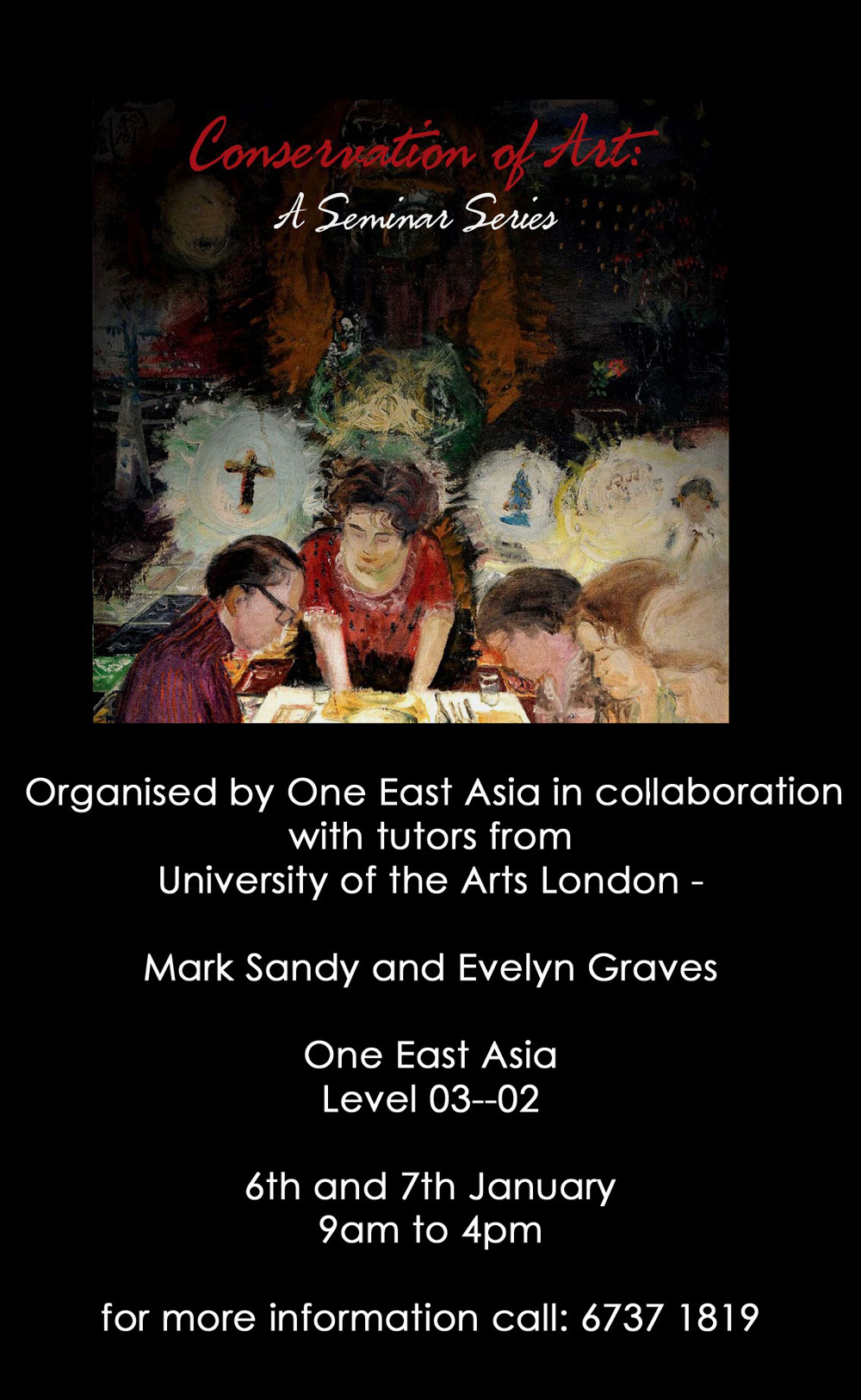 6-7 January 2011One East Asia is pleased to organise and host a seminar series ‘The Conservation of Art’ featuring a workshop-style presentation by Tutors from University of Arts London, Camberwell. The series has been created to raise awareness and to promote conserving as an integral part of collecting art. It is also to gauge local interest in further study in this specialist subject, and therefore assess the feasibility of setting up a more permanent educational function in this specialism in Singapore.