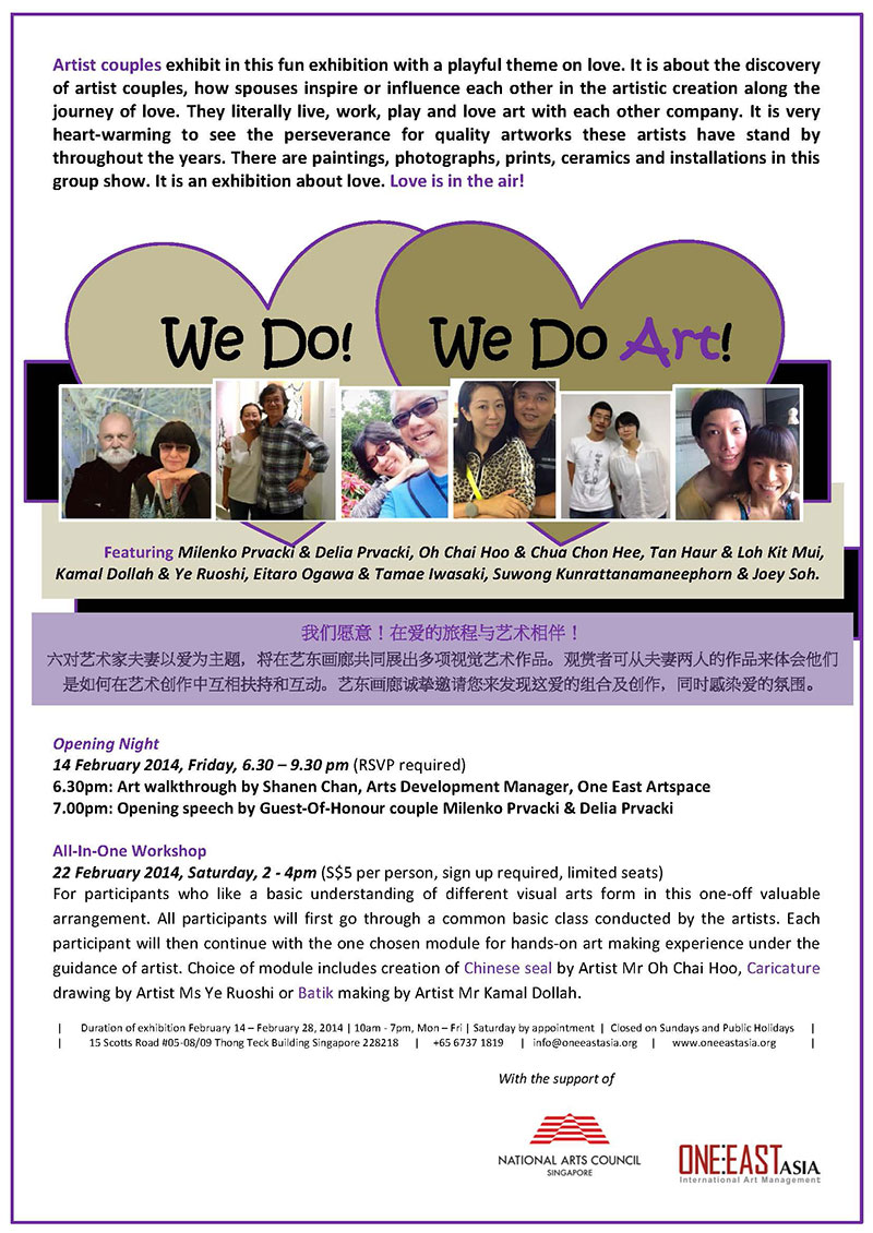 Participants will first go through a common basic class conducted by the artists. Each participant will then continue with the one chosen module for hands-on art making experience under the guidance of artist. Choice of module includes creation of Chinese seal, caricature or batik at S$5 per person.