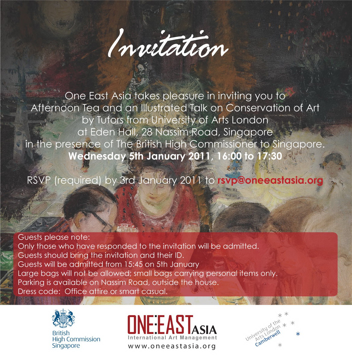 6-7 January 2011One East Asia is pleased to organise and host a seminar series ‘The Conservation of Art’ featuring a workshop-style presentation by Tutors from University of Arts London, Camberwell. The series has been created to raise awareness and to promote conserving as an integral part of collecting art. It is also to gauge local interest in further study in this specialist subject, and therefore assess the feasibility of setting up a more permanent educational function in this specialism in Singapore.
